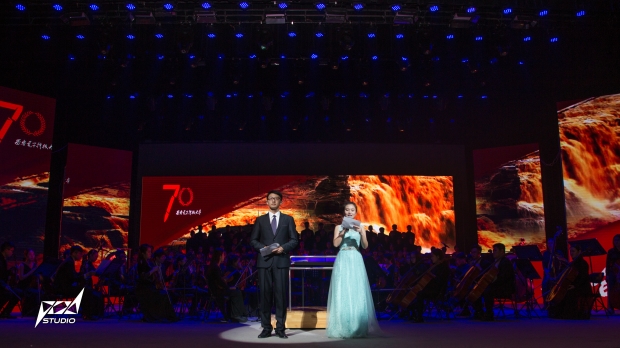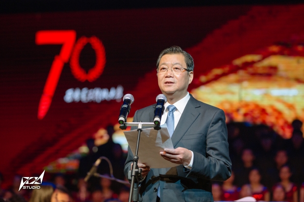 龙建成致开幕词,拉开音乐会的帷幕。龙建成在致辞中祝贺《黄河大合唱》在富平公演,他指出,西电学子带着《黄河大合唱》这个节目来富平,就是用爱国、进取的实际行动告慰老一辈无产阶级革命家,并向勤劳、智慧的富平人民汇报。他表示,在富平县委、县政府的大力支持下,西电与四川现代教育集团联合举办的独立学院——西安电子科技大学长安学院已于今年11月6日在富平正式开工。长安学院的落成将对富平县增强区域发展综合实力,提高城市发展水平、优化教育结构和人才结构产生重要意义,西电将大力支持长安学院的建设,让西电和富平的校地合作结出丰硕的成果。 龙建成指出,西电自创立、发展到壮大,始终与中国革命史紧紧相连,为共和国通讯事业的发展做出了不可磨灭的贡献。近年来,学校更加主动地融入经济建设和社会发展的实践,做建设“三个陕西”的领跑者,助力“陕西梦”;他表示,今年恰逢中国人民抗日战争暨世界反法西斯战争胜利70周年,西电大学生艺术团两百余名师生历史半年的时间排演《黄河大合唱》,青年学生用自己的方式表达了对中国特色社会主义共同理想的向往、对民族精神的传承,对时代精神的创造;也以自己的方式表达着实现“中国梦”的坚定决心。