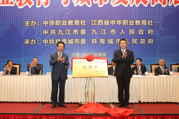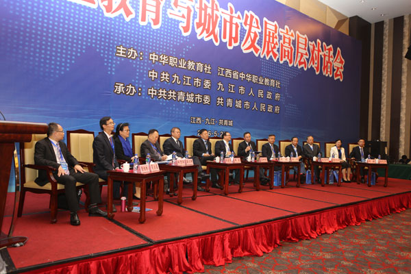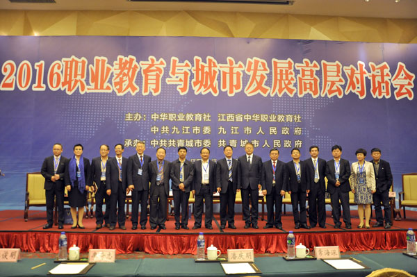 5月26日,由中华职业教育社、江西省中华职业教育社、中共九江市委、九江市人民政府联袂主办,中共共青城市委、共青城市人民政府承办的“2016职业教育与城市发展高层对话会”在江西九江共青城举办。全国人大常委会副委员长、中华职业教育社理事长陈昌智出席并作主旨讲话。江西省省委常委、省委统战部部长蔡晓明、中共九江市委书记杨伟东分别致辞。中华职业教育社总干事王金宝,江西省政协副主席、省中华职业教育社主任孙菊生,九江市委副书记、九江市人民政府市长林彬杨,江西省委统战部副部长高鹰群,江西省教育厅副厅长郭奕珊等出席会议。中华职业教育社副理事长、四川现代教育集团董事长苏华主持了开幕会议,杨农副总干事作会议总结。会上举行了中华职业教育社在共青城市设立“职业教育促进经济社会发展试验区”授牌仪式,由陈昌智理事长向黄斌书记授牌。王金宝与林彬杨分别代表中华职业教育社和九江市人民政府签署了“战略合作框架协议书”,与共青城人民政府市长卢宝云签署了共同推进“职业教育促进经济社会发展试验区”建设协议书。