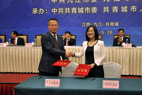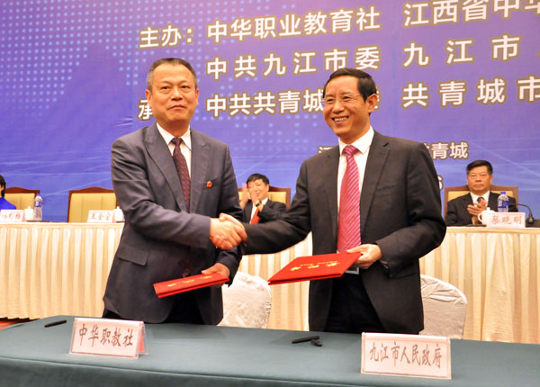 王金宝总干事与共青城市人民政府市长卢宝云签署共同推进“职业教育促进经济社会发展试验区”建设协议书
