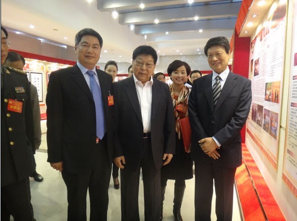 全国政协副主席郑万通与全国政协副主席陈宗兴来到苏华董事长的展板前,仔细阅读展板内容,并与苏华董事长亲切合影