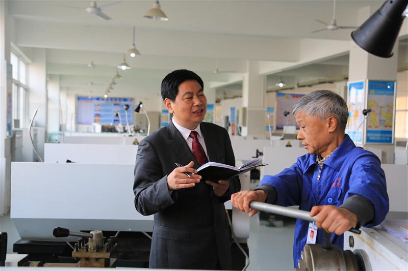 全国政协委员、民建中央常委、民建四川省委副主委苏华在德阳市黄许职业中专学校机加实训车间同退休返聘专业技术人员杨进平老师交谈。