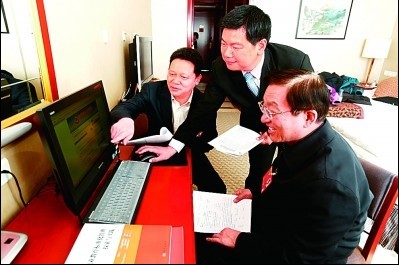 3月1日,全国政协委员杨兴平(左)、杨学义(右)、苏华(中)在驻地宾馆就相关提案进行交流。