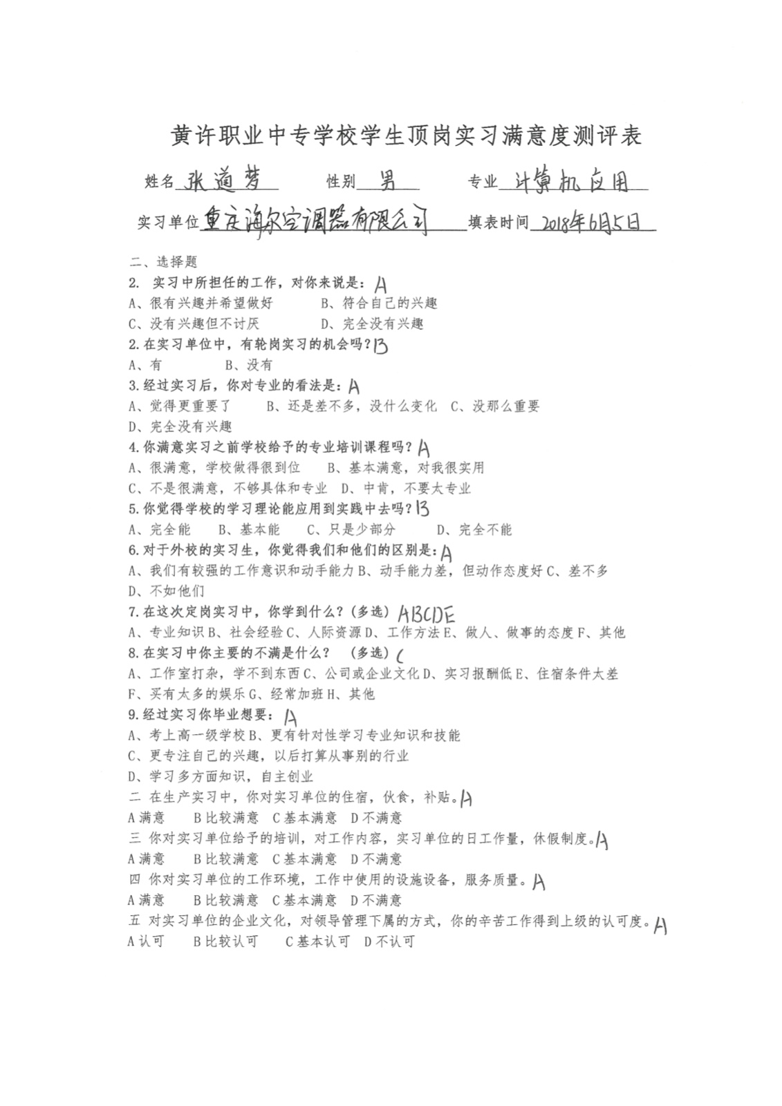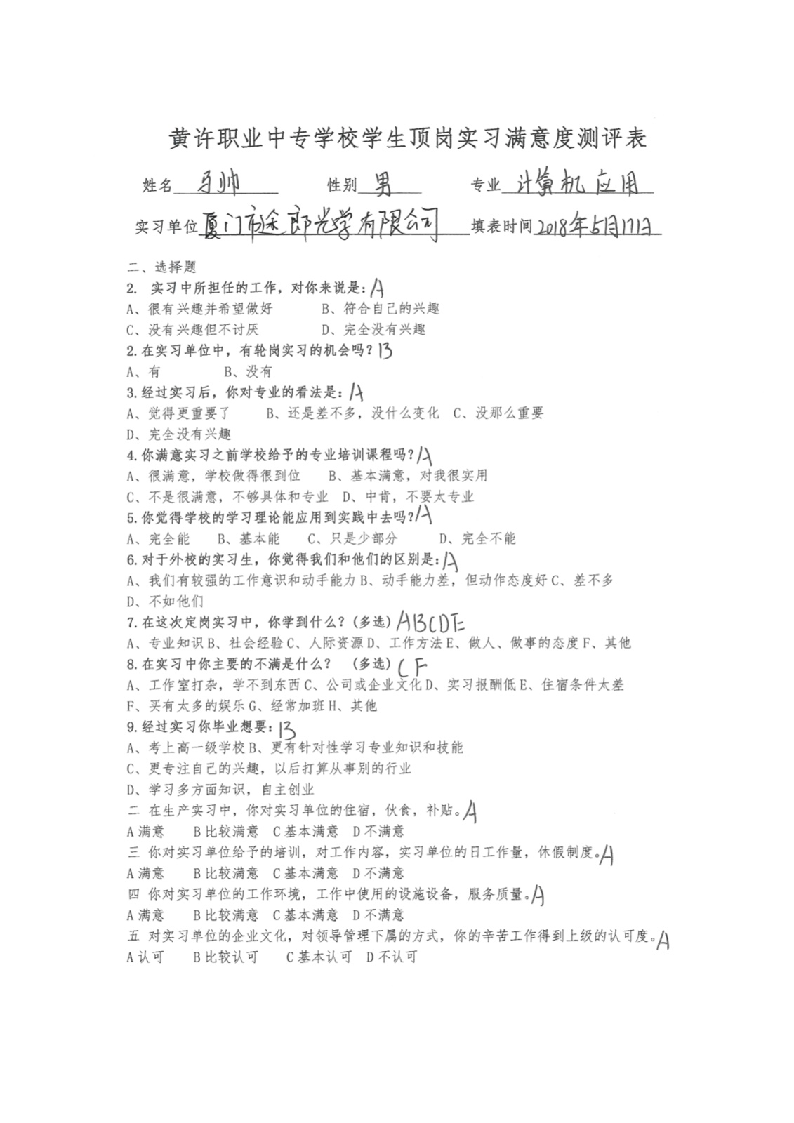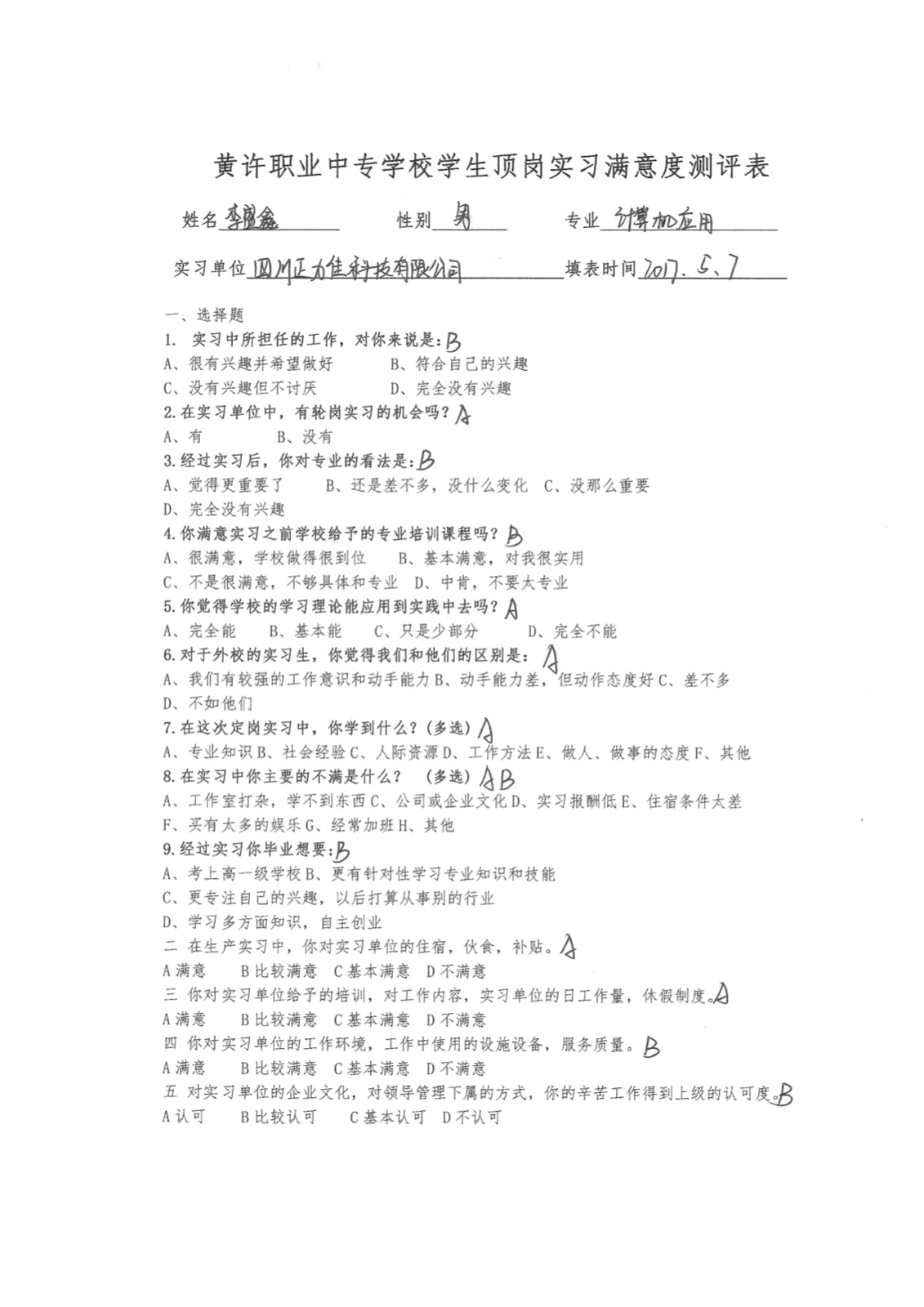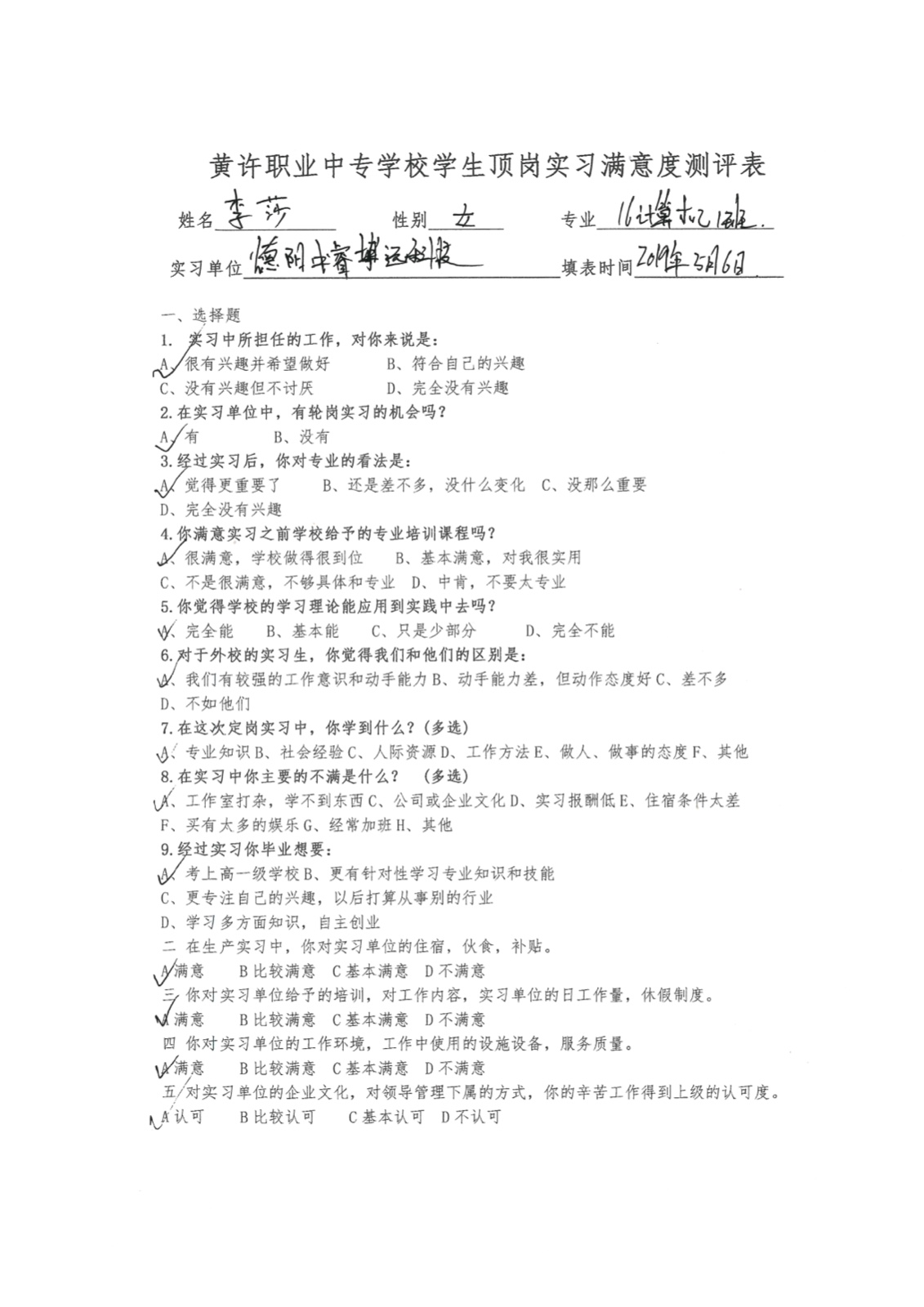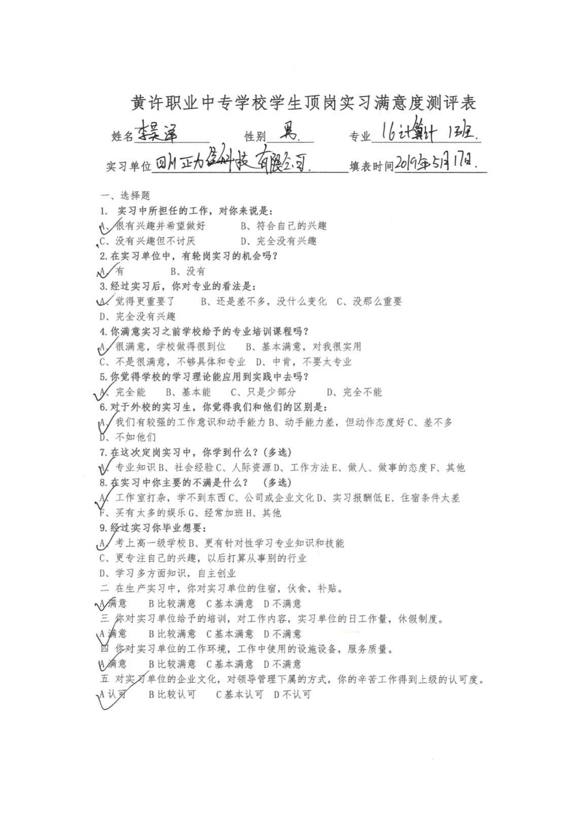 · 顶岗实习学生满意度测评表